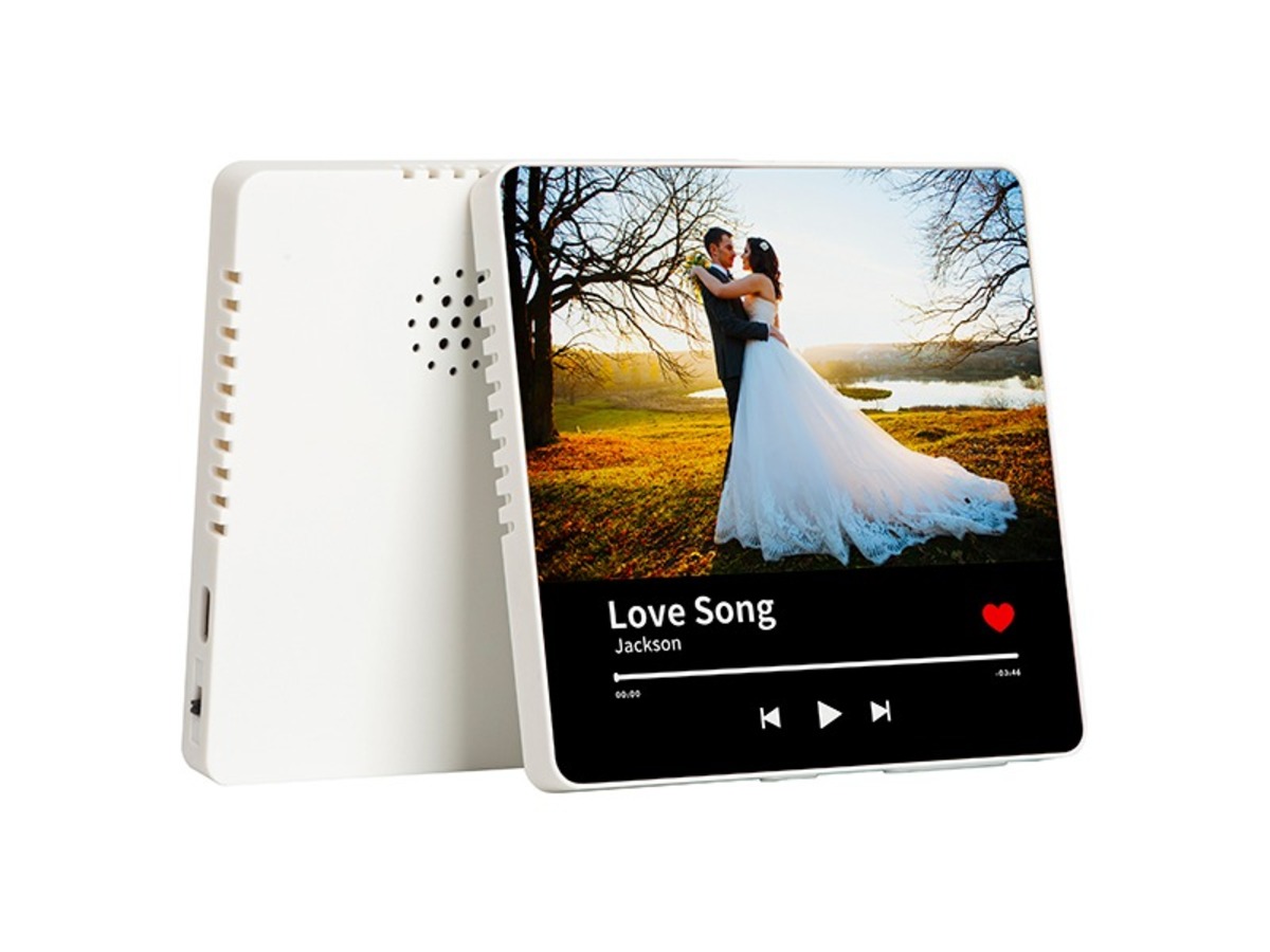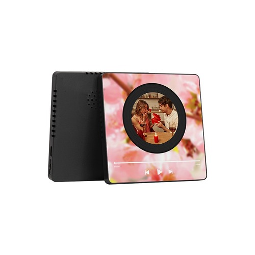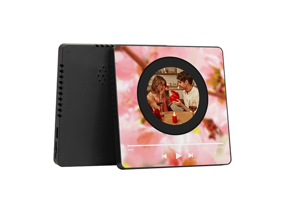 Magnete per frigorifero con inserto in vetro HD personalizzabile a sublimazione, possibilità di inserire musica tramite USB e con funzione di registrazione voce.