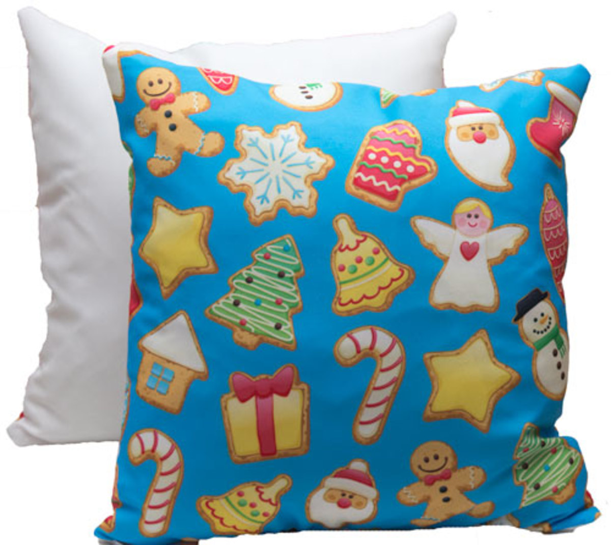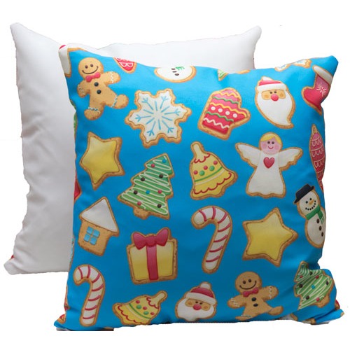 Cuscino con fronte bianco stampabile a sublimazione e retro con grafica natalizia in celeste o in rosa.