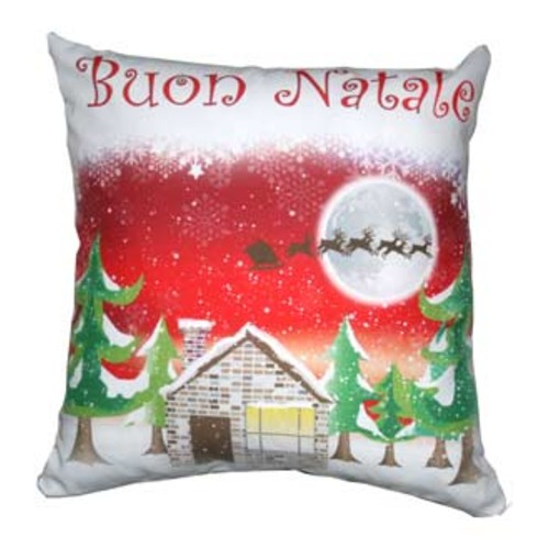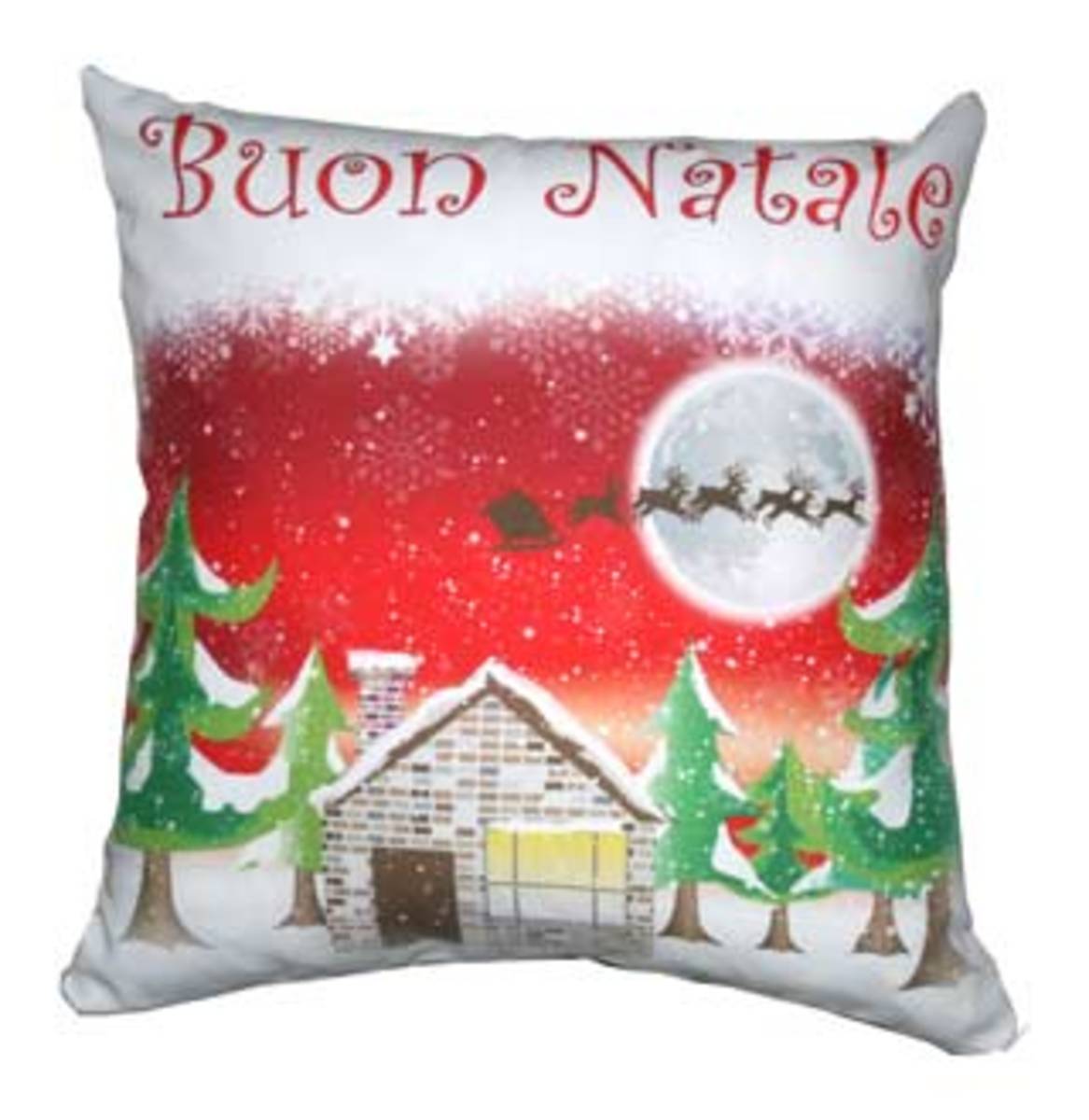 Cuscino 40x40 con grafica natalizia e scritta "Buon Natale" sul fronte e personalizzabile in sublimazione sul retro. 100% poliestere. Completo di imbottitura