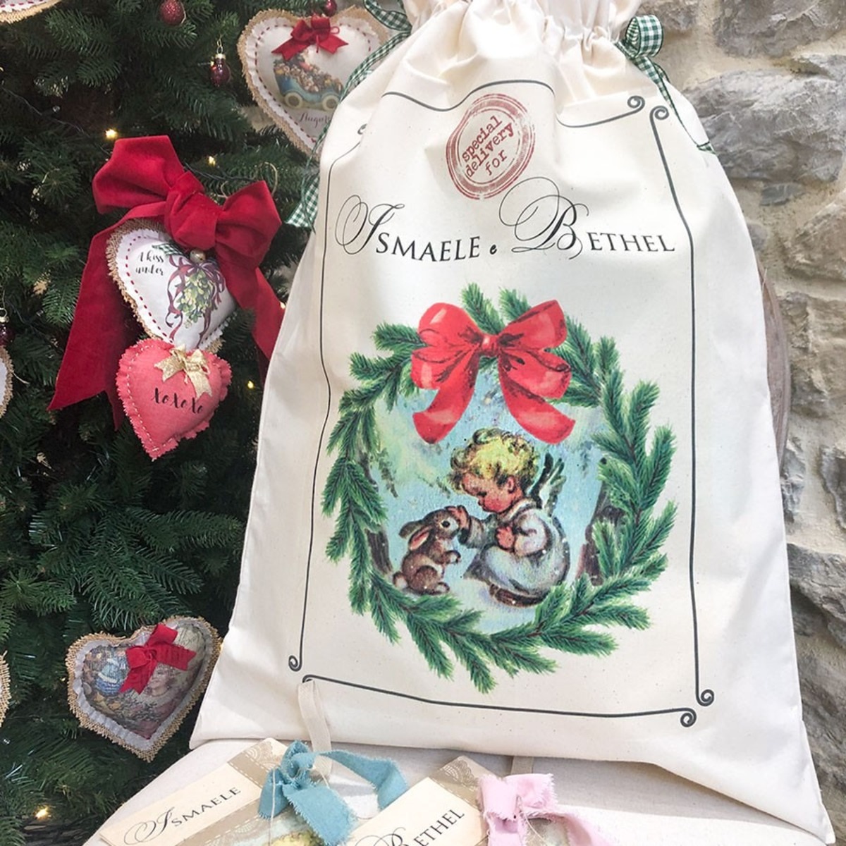 Sacco babbo Natale personalizzabili in sublimazione. Chiusura a cordoncino. Disponibile in due taglie: